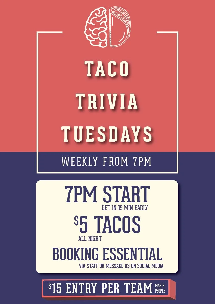 Join our amazing host Lisa for a night of brain teasers and head scratches while you enjoy $5 tacos all night
